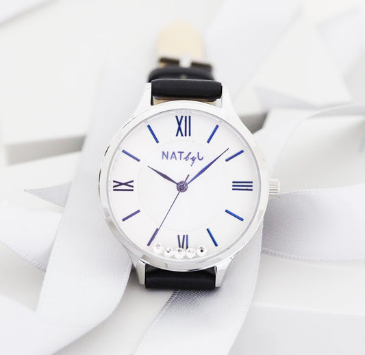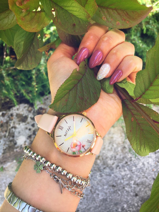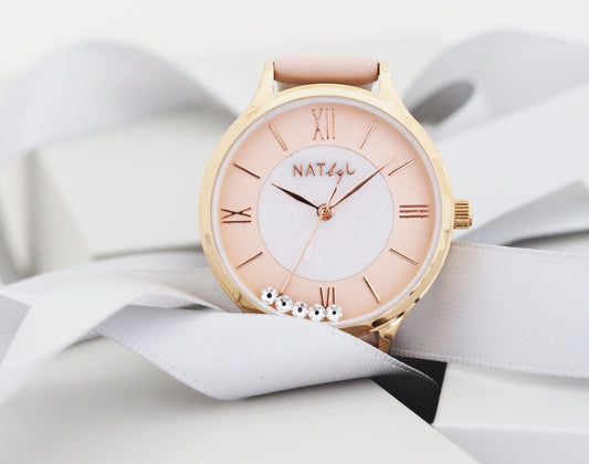 The pink hue accentuates my skin tone and I love the free moving crystals on the clock face that adds subtle hints of feminity and playfulness to the watch.