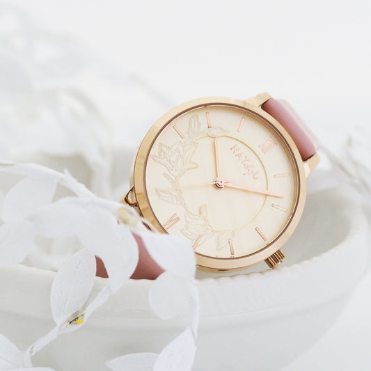 Classic elegant watch with beautiful design! Really love the embroidery flower design. Perfect colour combination for pastel pink genuine leather strap and rose gold watch.